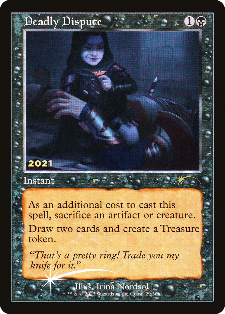 Draw two cards and create a Treasure token. (It's an artifact with “{T}, Sacrifice this artifact: Add one mana of any color.”)