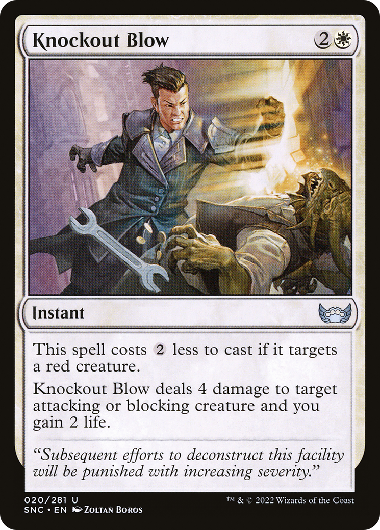 Knockout Blow deals 4 damage to target attacking or blocking creature and you gain 2 life.