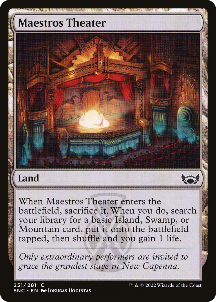 When Maestros Theater enters the battlefield, sacrifice it. When you do, search your library for a basic Island, Swamp, or Mountain card, put it onto the battlefield tapped, then shuffle and you gain 1 life.