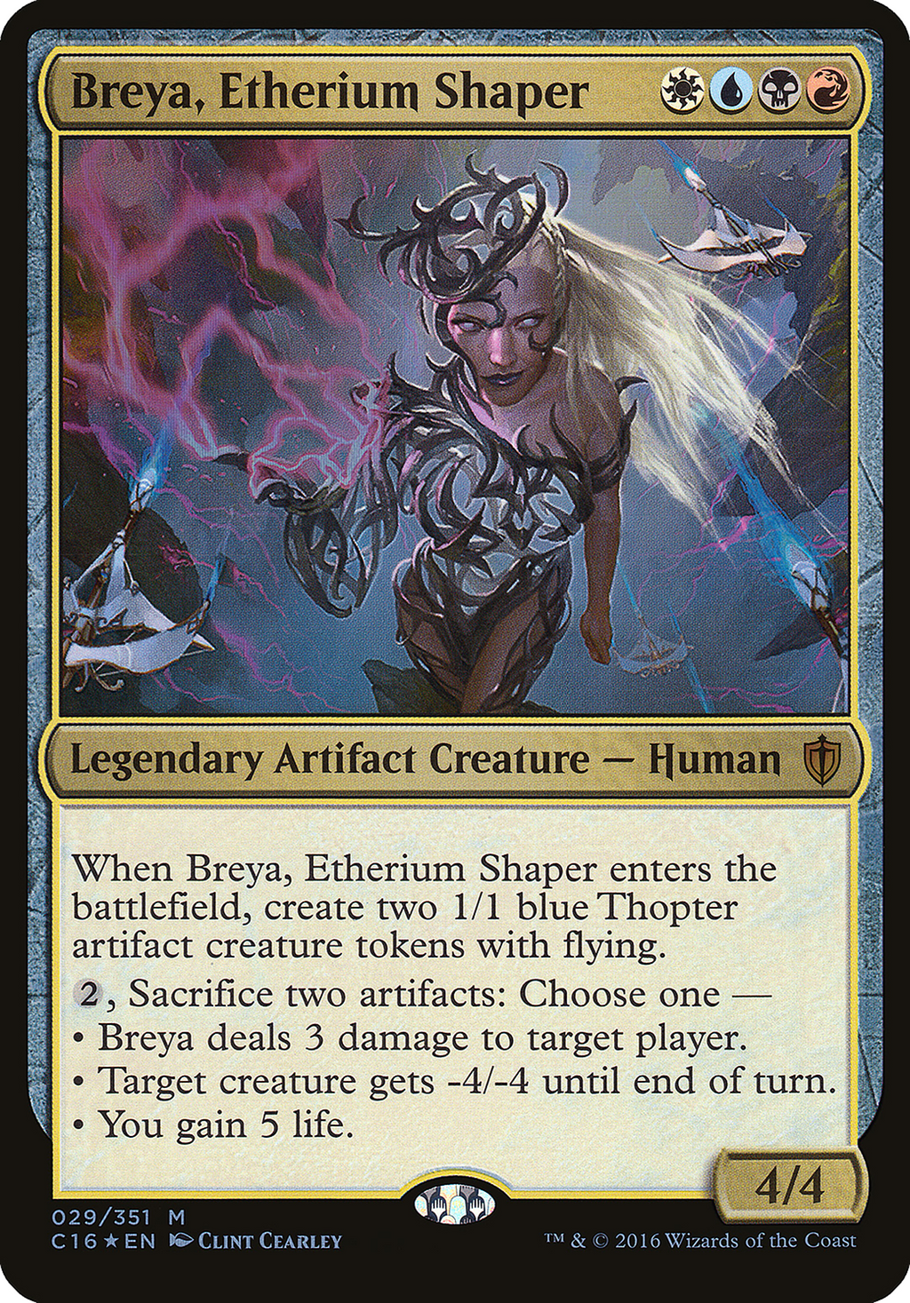 When Breya, Etherium Shaper enters the battlefield, create two 1/1 blue Thopter artifact creature tokens with flying.