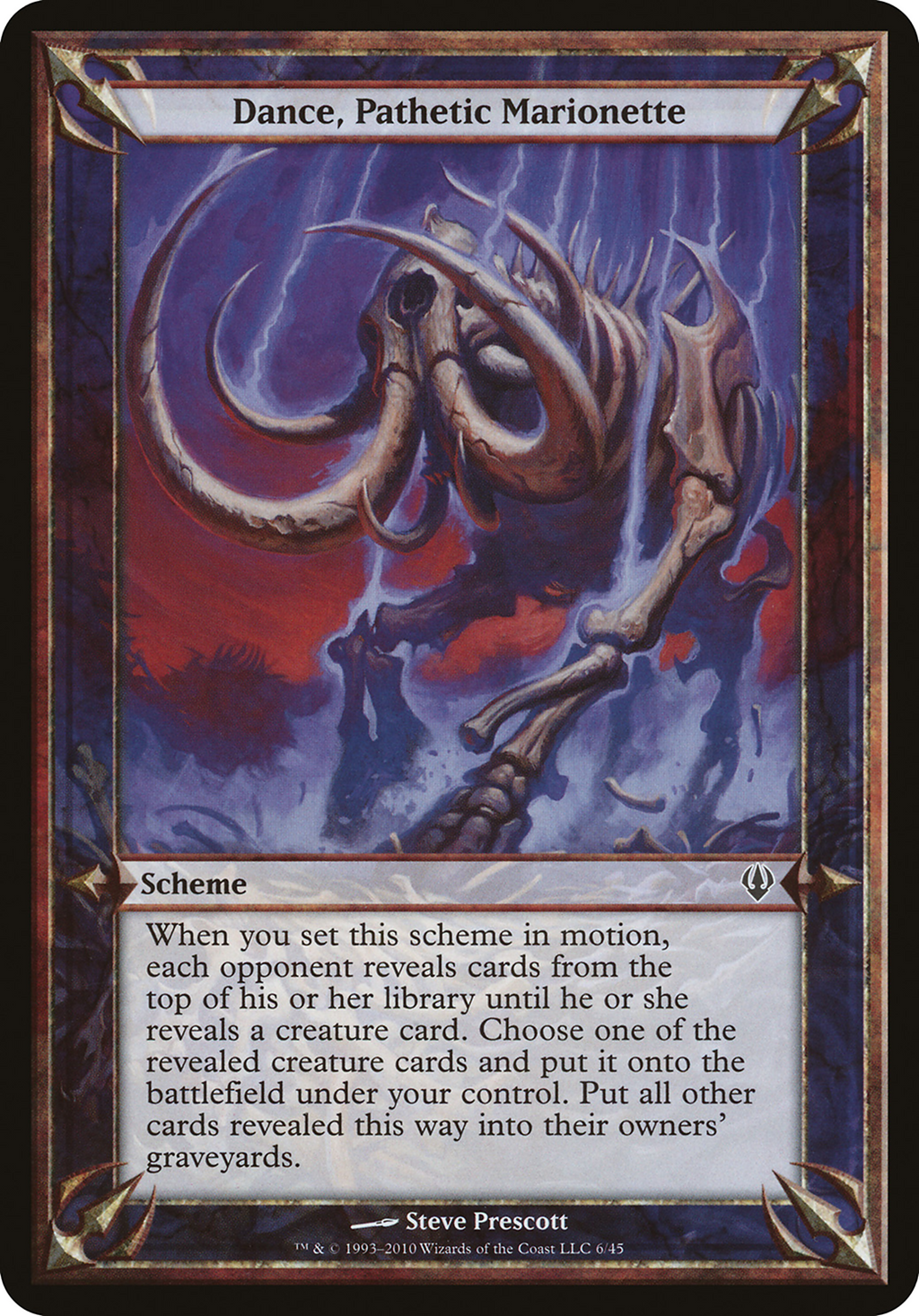 When you set this scheme in motion, each opponent reveals cards from the top of their library until they reveal a creature card. Choose one of the revealed creature cards and put it onto the battlefield under your control. Put all other cards revealed this way into their owners' graveyards.