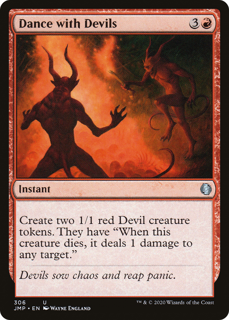 Create two 1/1 red Devil creature tokens. They have "When this creature dies, it deals 1 damage to any target."