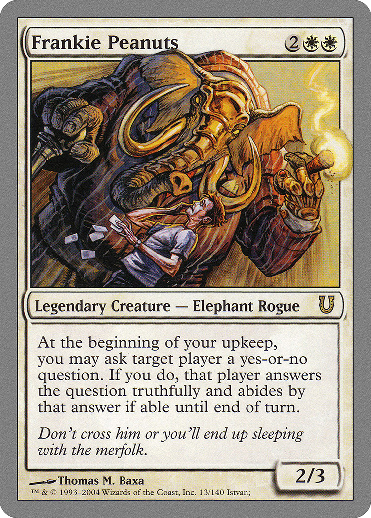 At the beginning of your upkeep, you may ask target player a yes-or-no question. If you do, that player answers the question truthfully and abides by that answer if able until end of turn.
