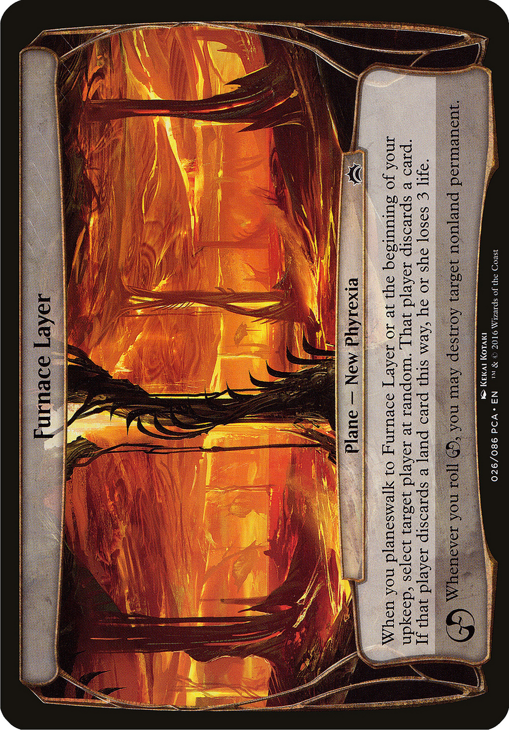 When you planeswalk to Furnace Layer or at the beginning of your upkeep, select target player at random. That player discards a card. If that player discards a land card this way, they lose 3 life.