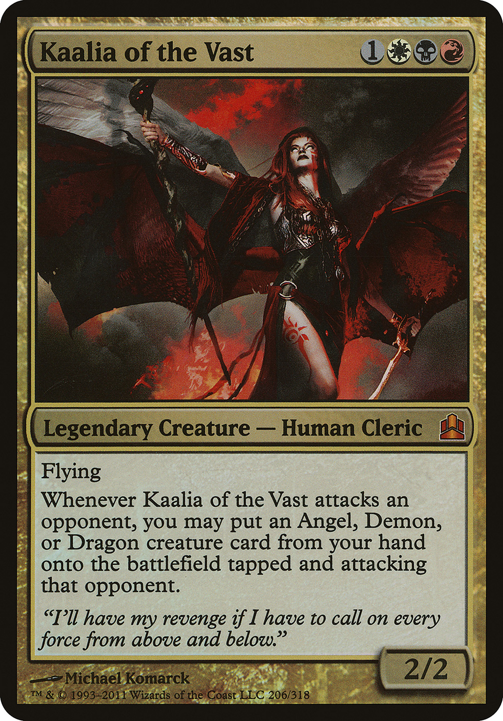 Whenever Kaalia of the Vast attacks an opponent, you may put an Angel, Demon, or Dragon creature card from your hand onto the battlefield tapped and attacking that opponent.