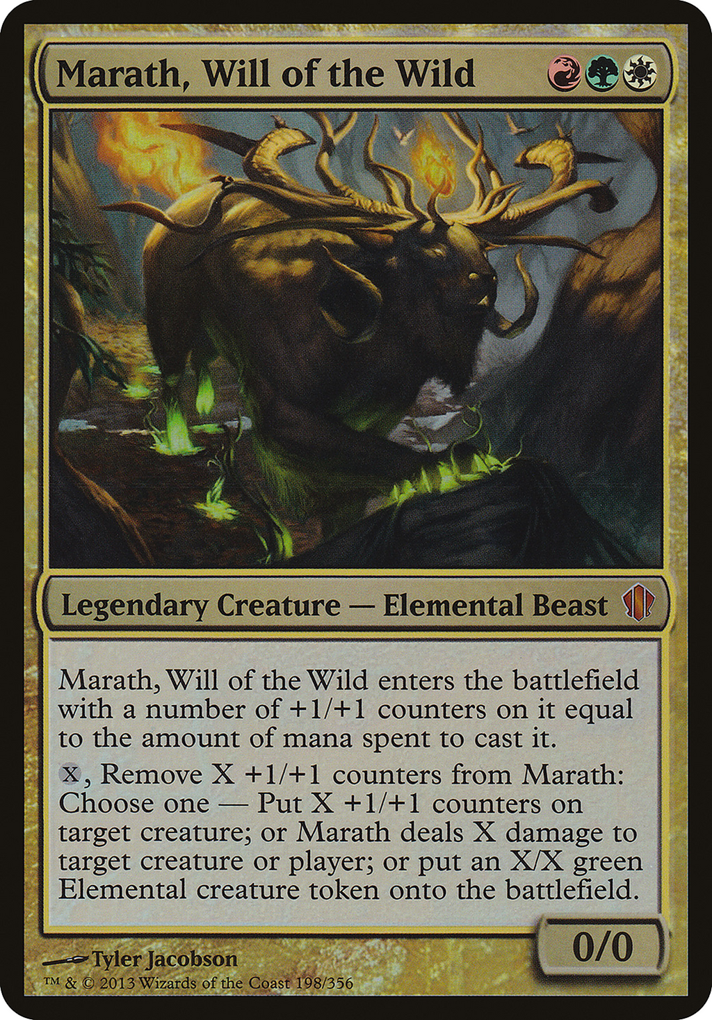 Marath, Will of the Wild enters the battlefield with a number of +1/+1 counters on it equal to the amount of mana spent to cast it.