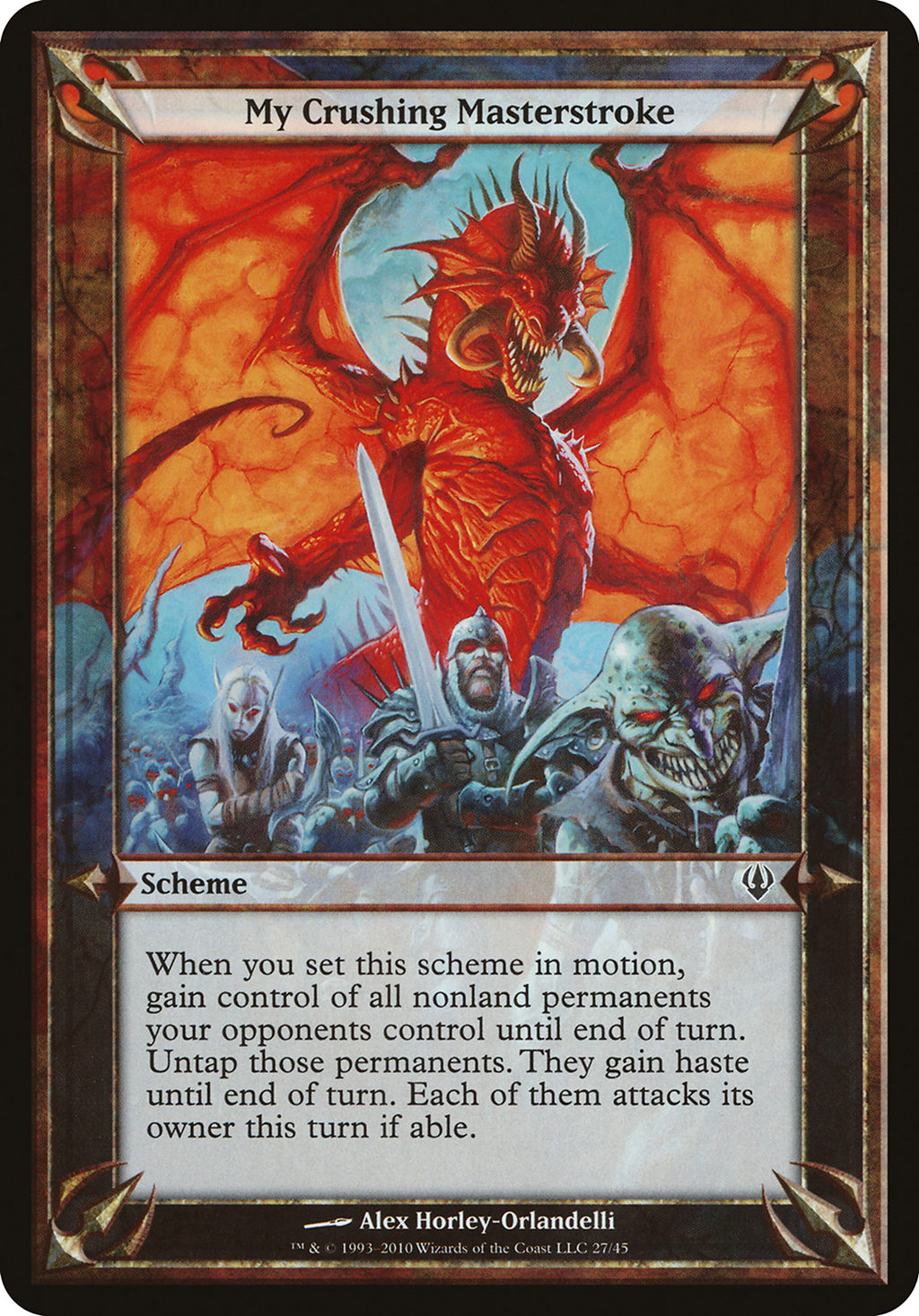 When you set this scheme in motion, gain control of all nonland permanents your opponents control until end of turn. Untap those permanents. They gain haste until end of turn. Each of them attacks its owner this turn if able.