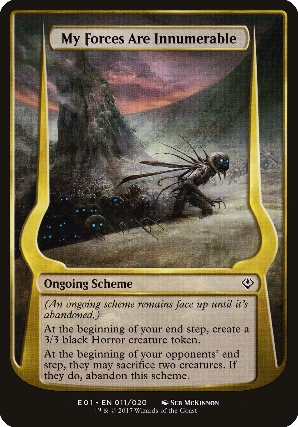 At the beginning of your end step, create a 3/3 black Horror creature token.