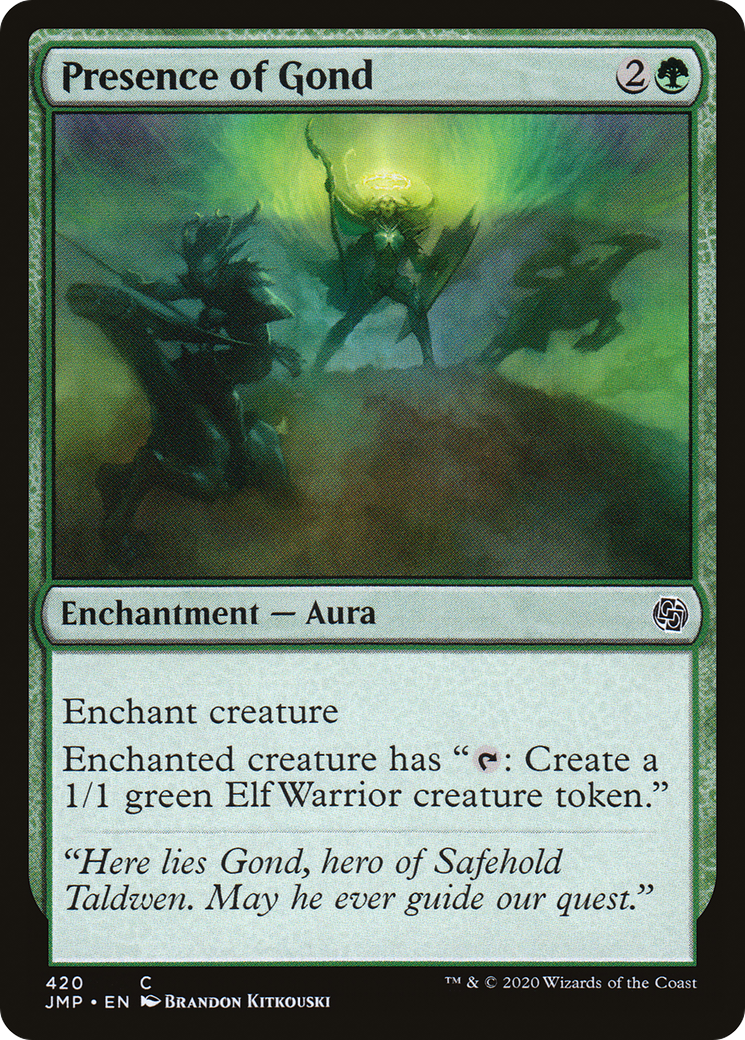Enchanted creature has "{T}: Create a 1/1 green Elf Warrior creature token."