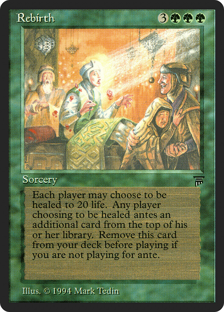 Remove Rebirth from your deck before playing if you're not playing for ante. Each player may ante the top card of their library. If a player does, that player's life total becomes 20.