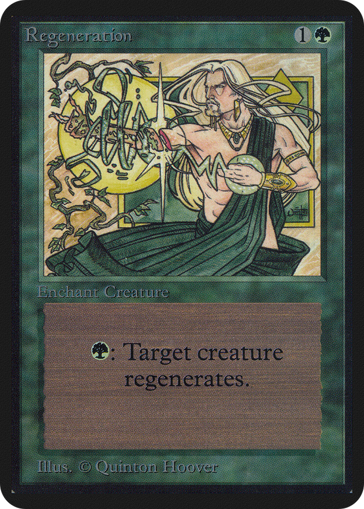 {G}: Regenerate enchanted creature. (The next time that creature would be destroyed this turn, it isn't. Instead tap it, remove all damage from it, and remove it from combat.)
