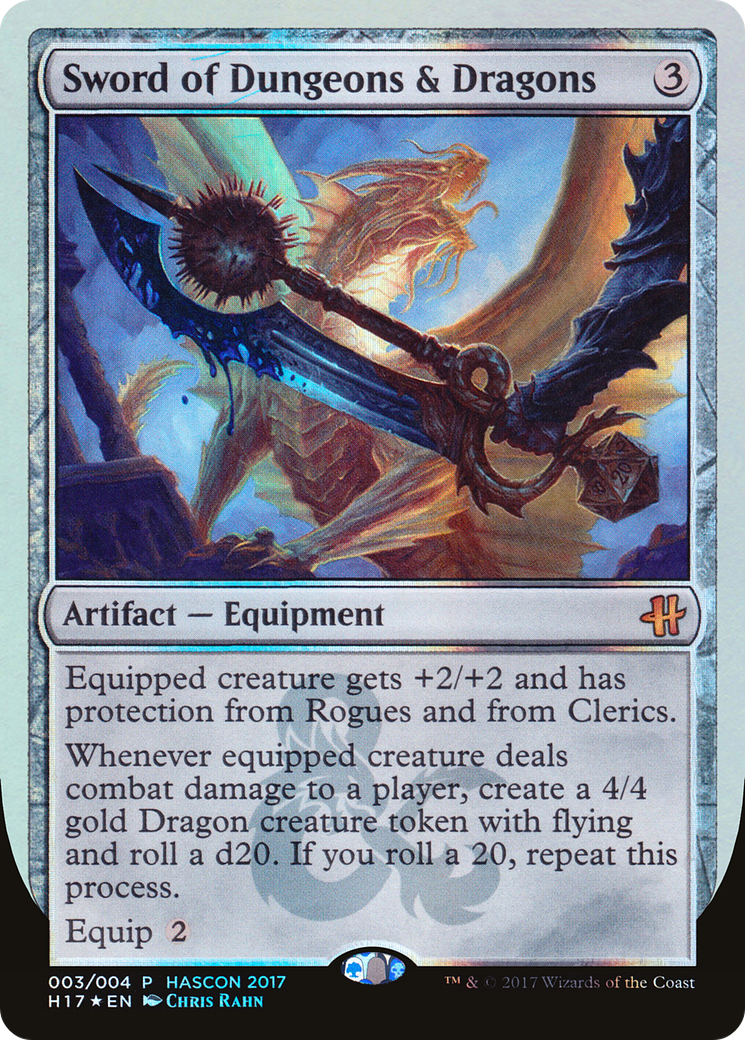 Whenever equipped creature deals combat damage to a player, create a 4/4 gold Dragon creature token with flying and roll a d20 (a twenty-sided die). If you roll a 20, repeat this process.
