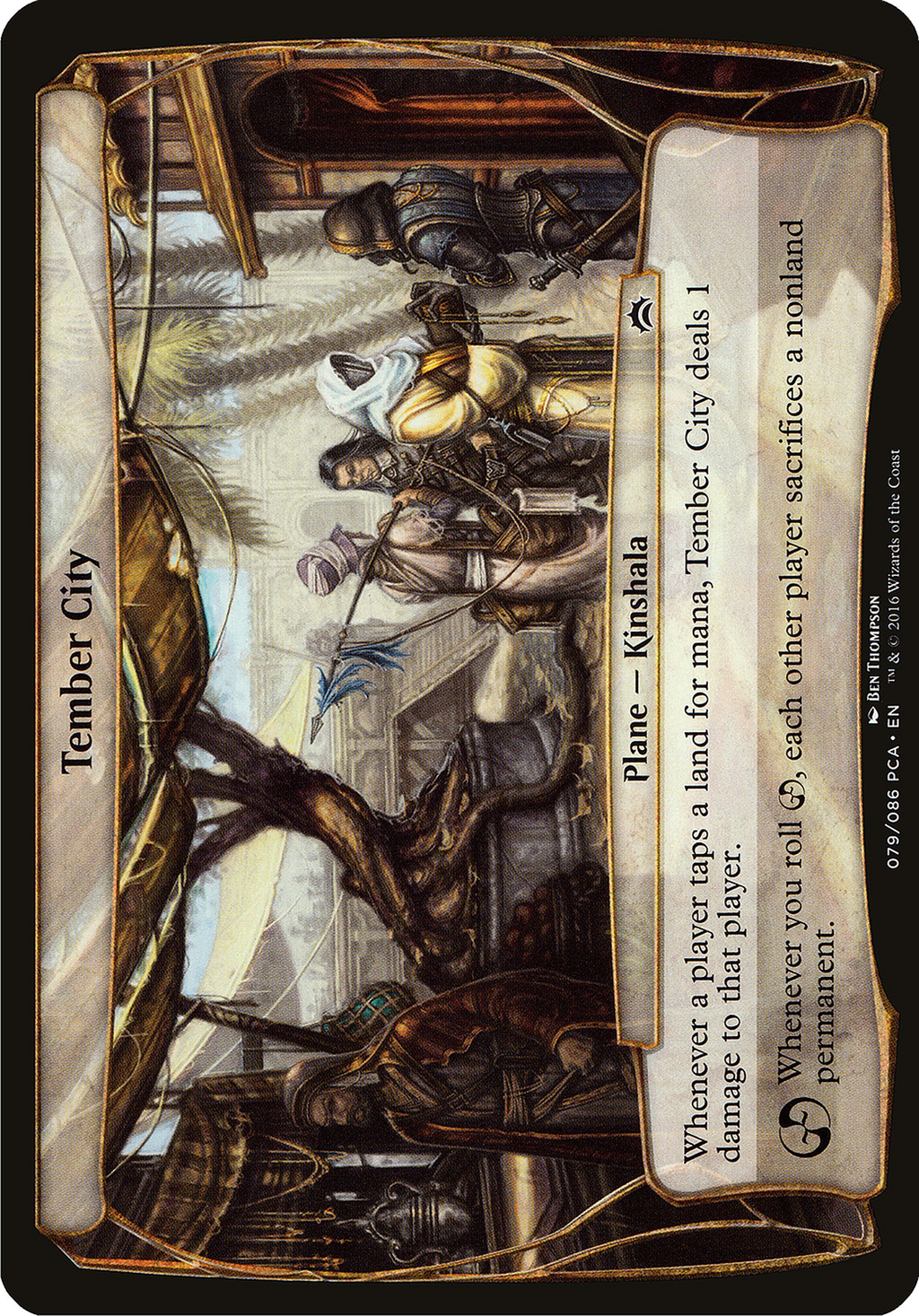 Whenever a player taps a land for mana, Tember City deals 1 damage to that player. Whenever you roll {CHAOS}, each other player sacrifices a nonland permanent.