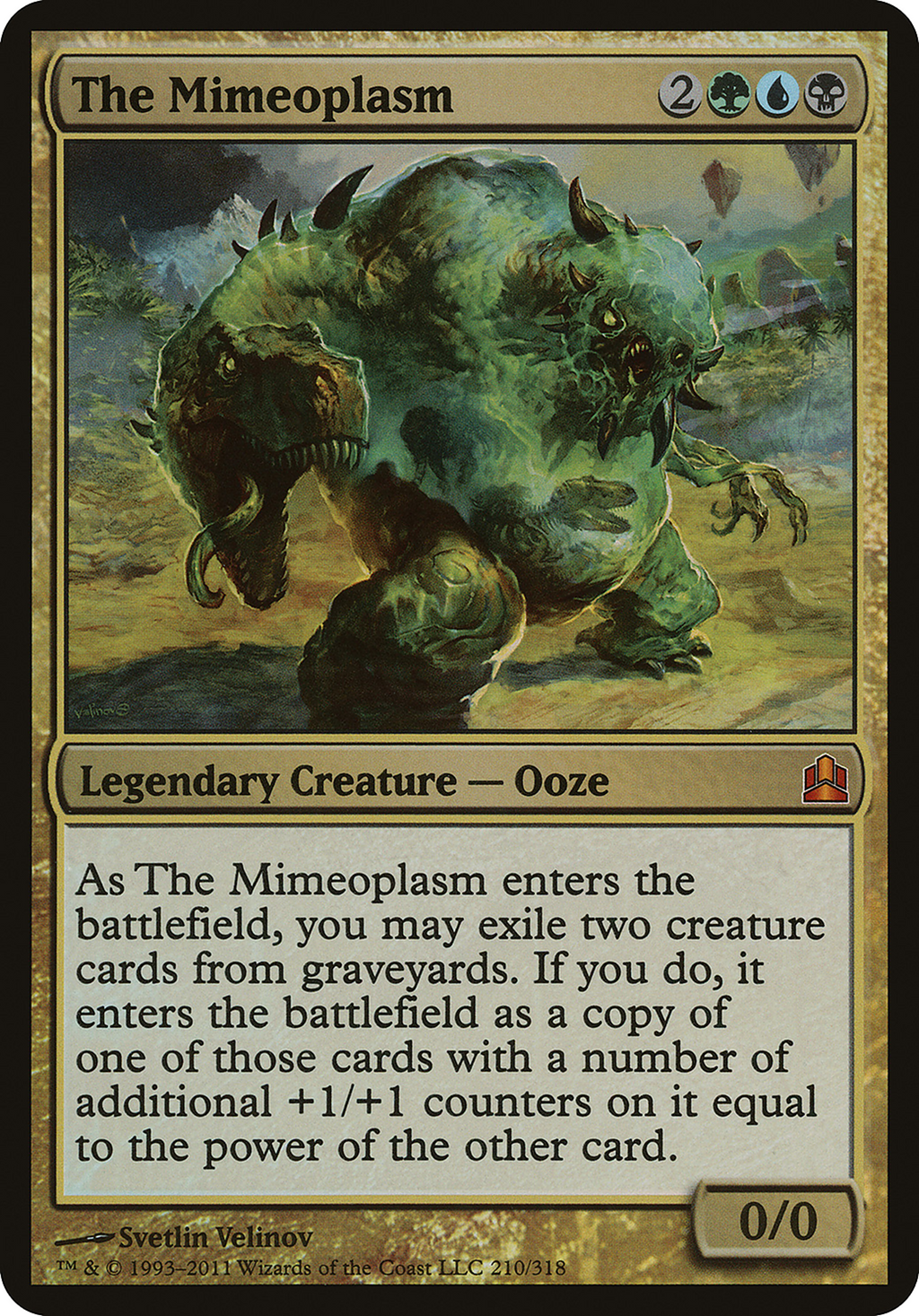 As The Mimeoplasm enters the battlefield, you may exile two creature cards from graveyards. If you do, it enters the battlefield as a copy of one of those cards with a number of additional +1/+1 counters on it equal to the power of the other card.