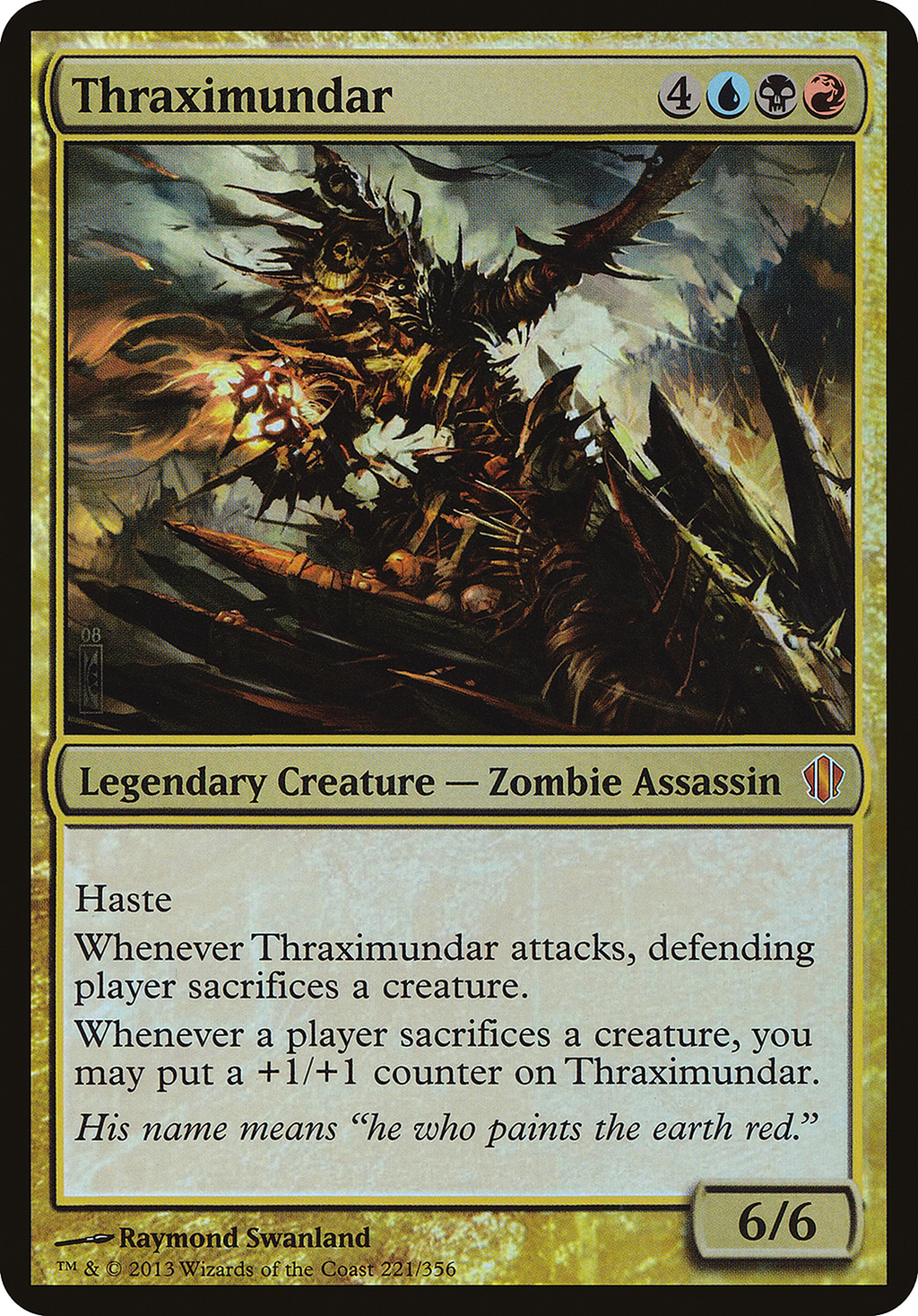 Whenever a player sacrifices a creature, you may put a +1/+1 counter on Thraximundar.