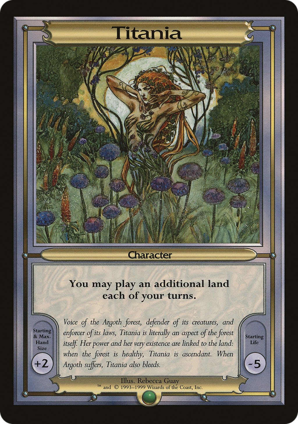Voice of the Argoth forest, defender of its creatures, and enforcer of its laws, Titania is literally an aspect of the forest itself. Her power and her very existence are linked to the land: when the forest is healthy, Titania is ascendant. When Argoth suffers, Titania also bleeds.