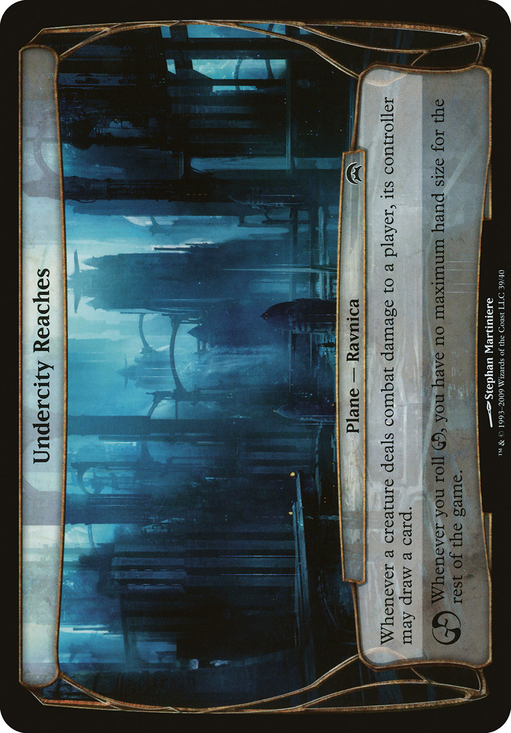 Whenever a creature deals combat damage to a player, its controller may draw a card. Whenever you roll {CHAOS}, you have no maximum hand size for the rest of the game.