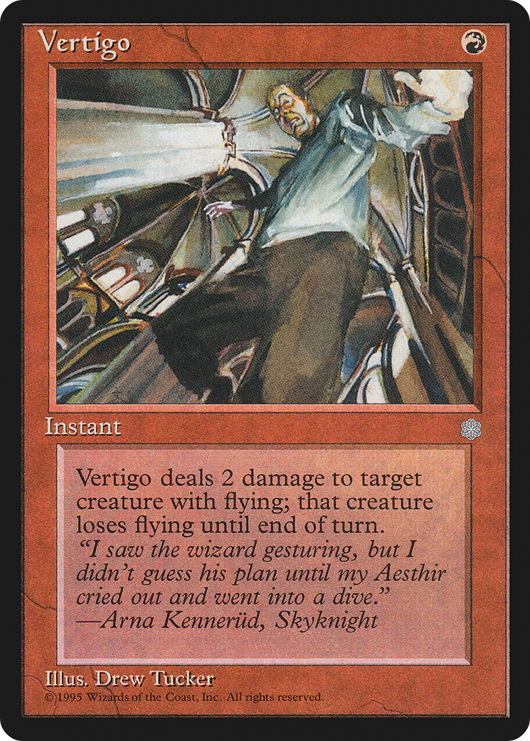 Vertigo deals 2 damage to target creature with flying. That creature loses flying until end of turn.