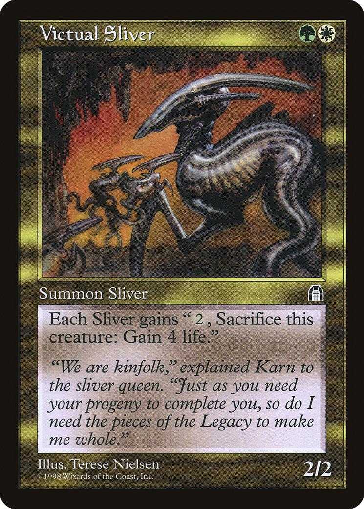 "We are kinfolk," explained Karn to the sliver queen. "Just as you need your progeny to complete you, so do I need the pieces of the Legacy to make me whole."