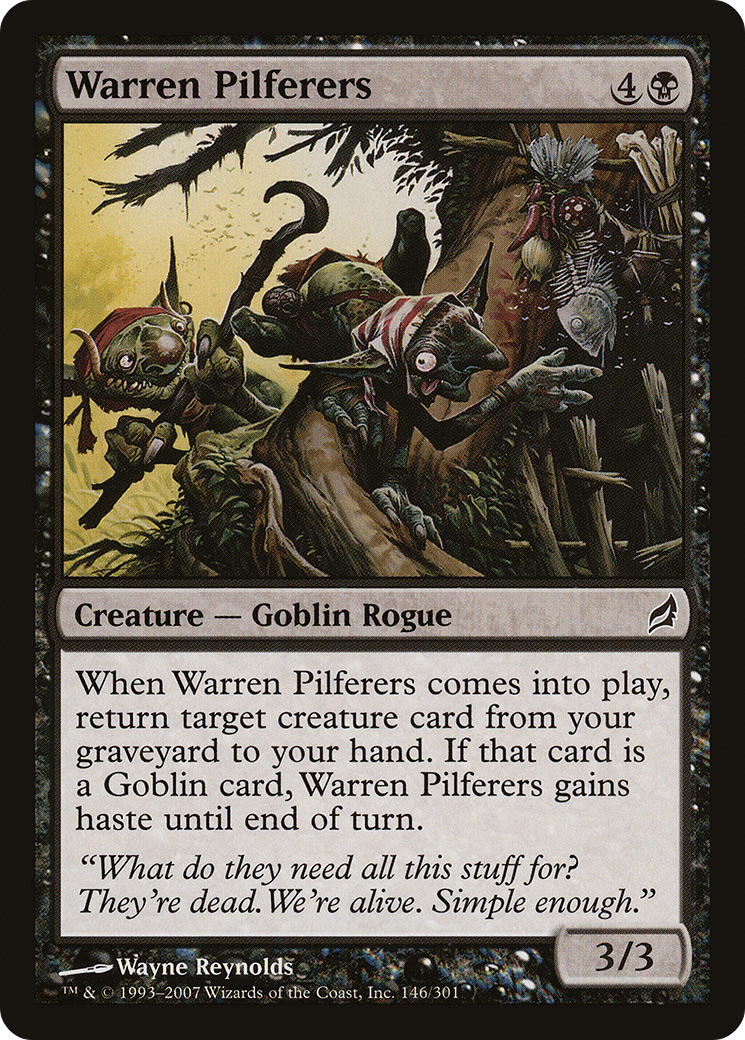 When Warren Pilferers enters the battlefield, return target creature card from your graveyard to your hand. If that card is a Goblin card, Warren Pilferers gains haste until end of turn.