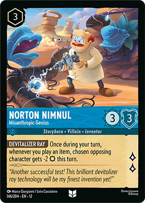 [Devitalizer Ray] Once during your turn, whenever you play an item, chosen opposing character gets -2 Strength this turn.