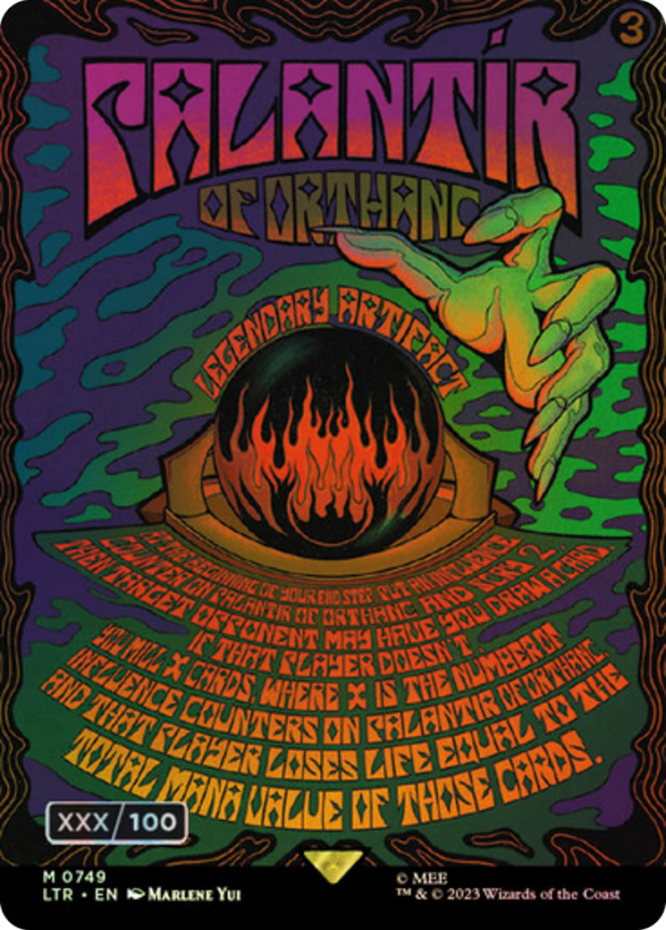 At the beginning of your end step, put an influence counter on Palantír of Orthanc and scry 2. Then target opponent may have you draw a card. If that player doesn't, you mill X cards, where X is the