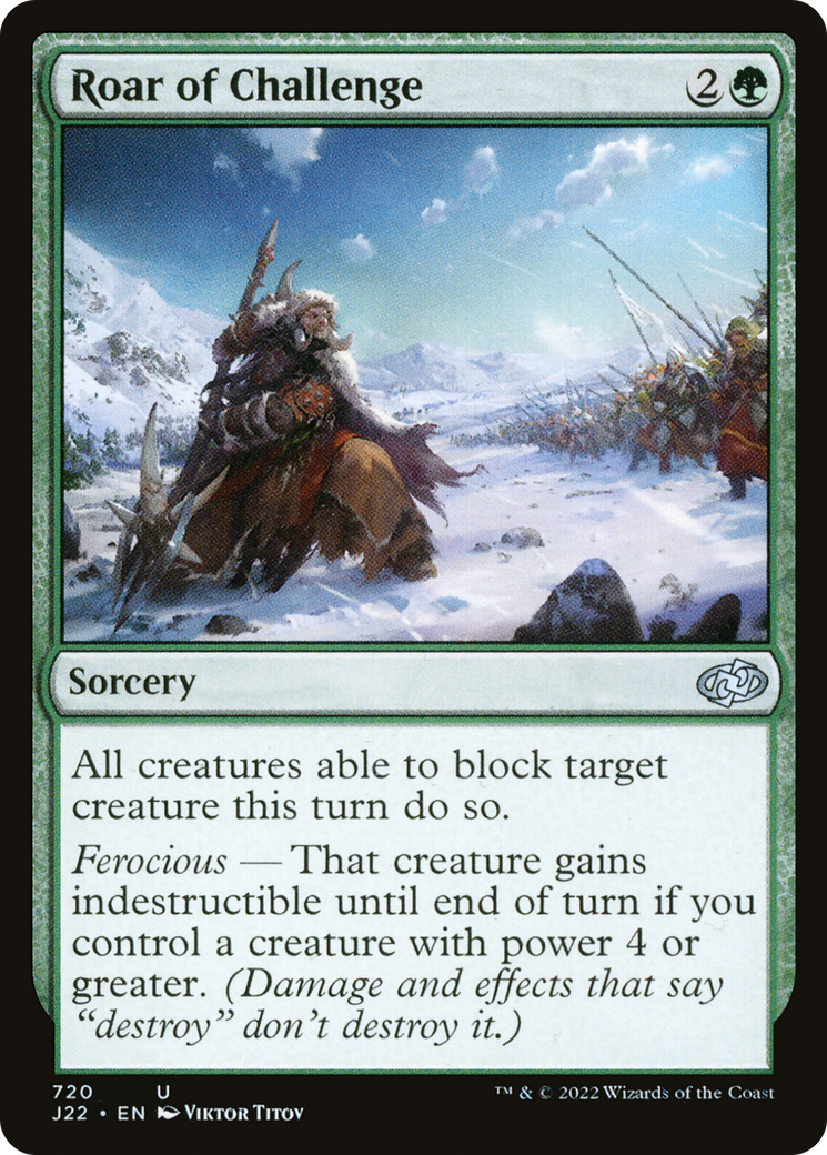 All creatures able to block target creature this turn do so. Ferocious — That creature gains indestructible until end of turn if you control a creature with power 4 or greater.