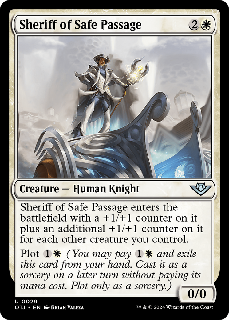 Sheriff of Safe Passage enters the battlefield with a +1/+1 counter on it plus an additional +1/+1 counter on it for each other creature you control.