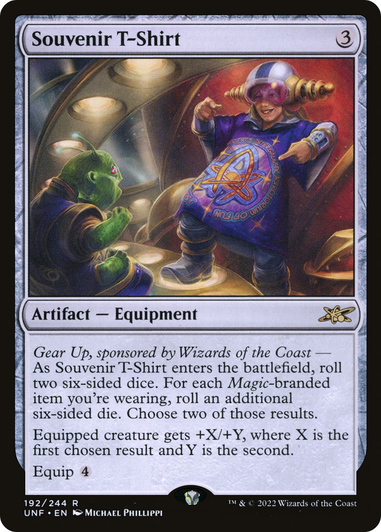 Gear Up, sponsored by Wizards of the Coast — As Souvenir T-Shirt enters the battlefield, roll two six-sided dice. For each Magic-branded Item you're wearing, roll an additional six-sided die. Choose two of those results.