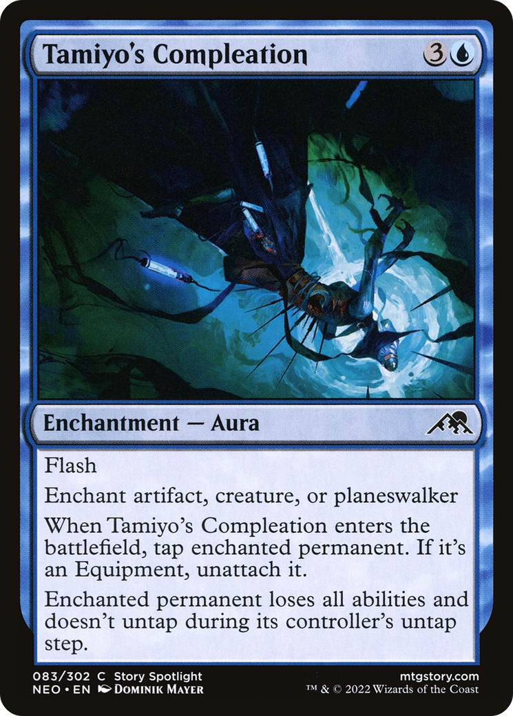 When Tamiyo's Compleation enters the battlefield, tap enchanted permanent. If it's an Equipment, unattach it.