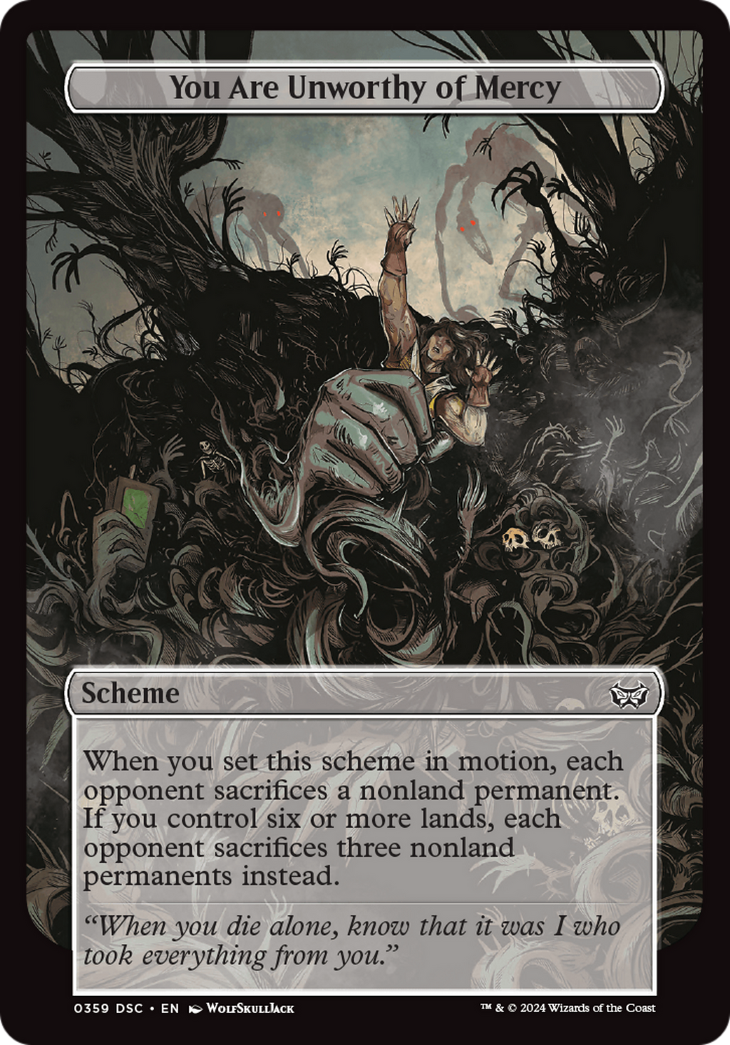When you set this scheme in motion, each opponent sacrifices a nonland permanent. If you control six or more lands, each opponent sacrifices three nonland permanents instead.